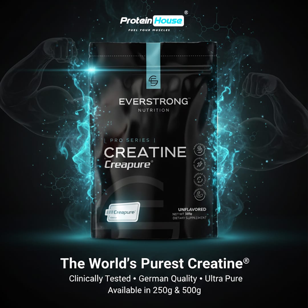 كرياتين مونوهيدرات (Creapure®) من everstrong هو علامة جودة خالية من المواد الحيوانية وبالتالي مناسب للنباتيين، بدون سكر مضاف، بدون مواد حافظة أو ملونة. يزيد الكرياتين من الأداء البدني خلال التمارين المتكررة القصيرة والعالية الكثافة. الكرياتين هو مادة ينتجها الجسم وتستخدم لتزويد عضلاتنا بالطاقة المباشرة. إنها مصدر طاقة أساسي لانقباض العضلات. يتم تحقيق الفائدة من تناول الكرياتين.